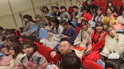 式典後は場所を変え、2024年度保育学科卒業パーティーが催されました。学生会と実行委員を中心に企画されたこのパーティーでは、式典とはまた違った雰囲気で思い出話や将来の話に花が咲き、途中学生が作成した2年間をまとめたスライドムービーの上映が行われるなど終始盛り上がりました。