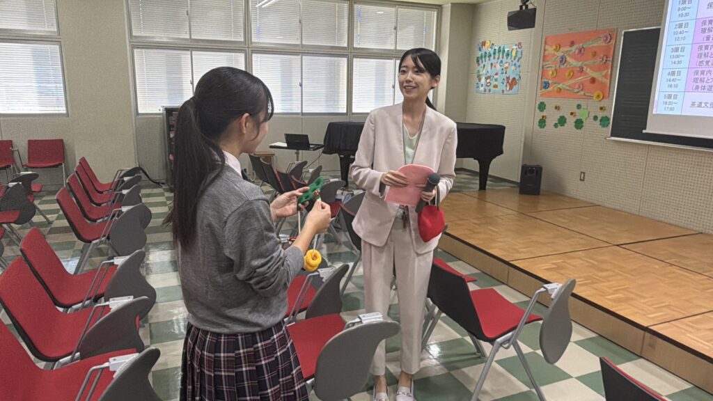 10時から全体セレモニーと施設見学が行われた後、保育学科では学科紹介のほかに教員による体験授業を行いました。教員に授業や実習について直接質問できる時間もあり、聞きたいことを十分に聞けた様子でした。