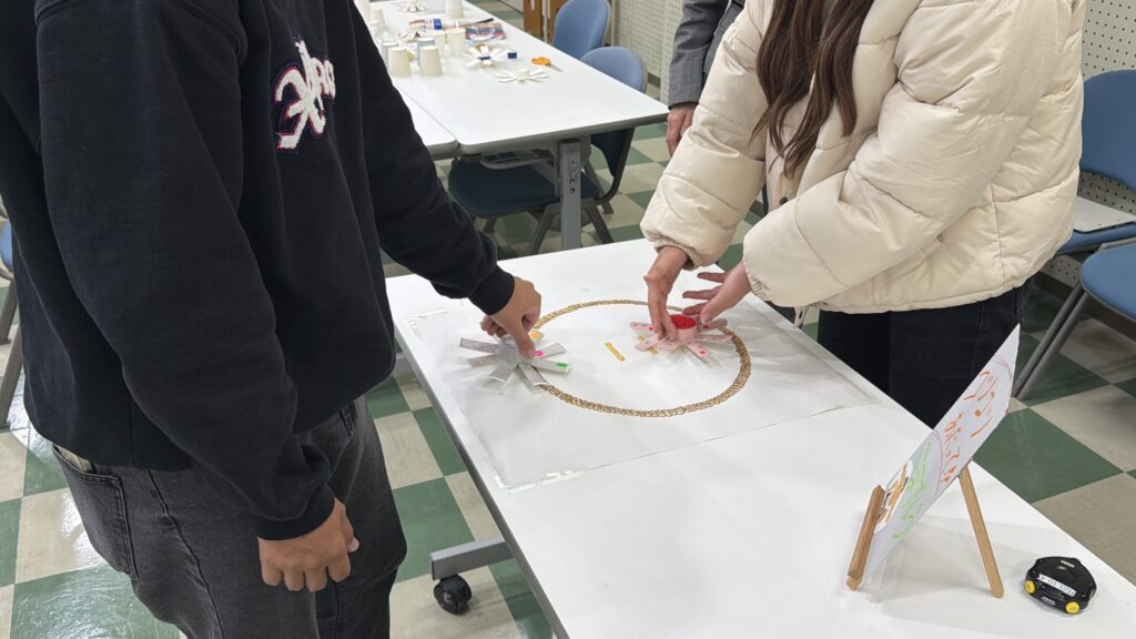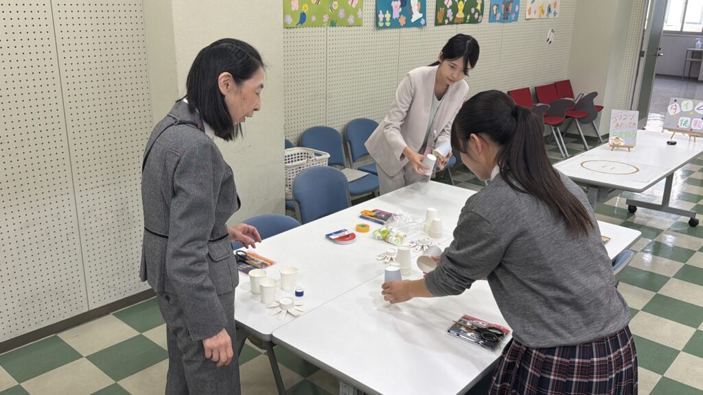 今回体験授業は『紙コップごまで遊ぼう』というテーマで、紙コップやペットボトルのキャップなどの身近なものを用いた製作体験を行いました。来場者の童心に帰ったような明るい表情が印象的で、本日のプログラムを楽しんでいただけた様子でした。