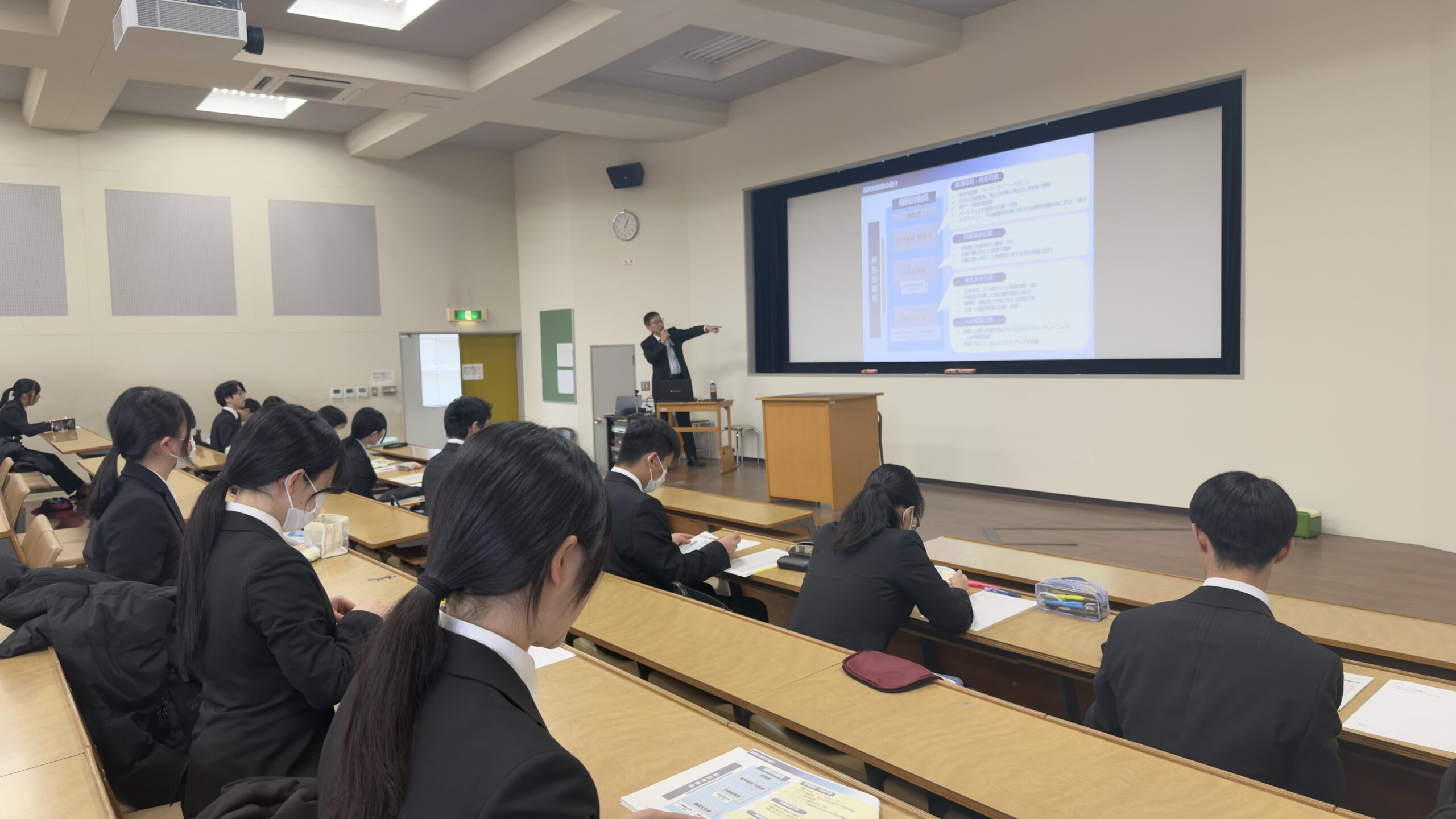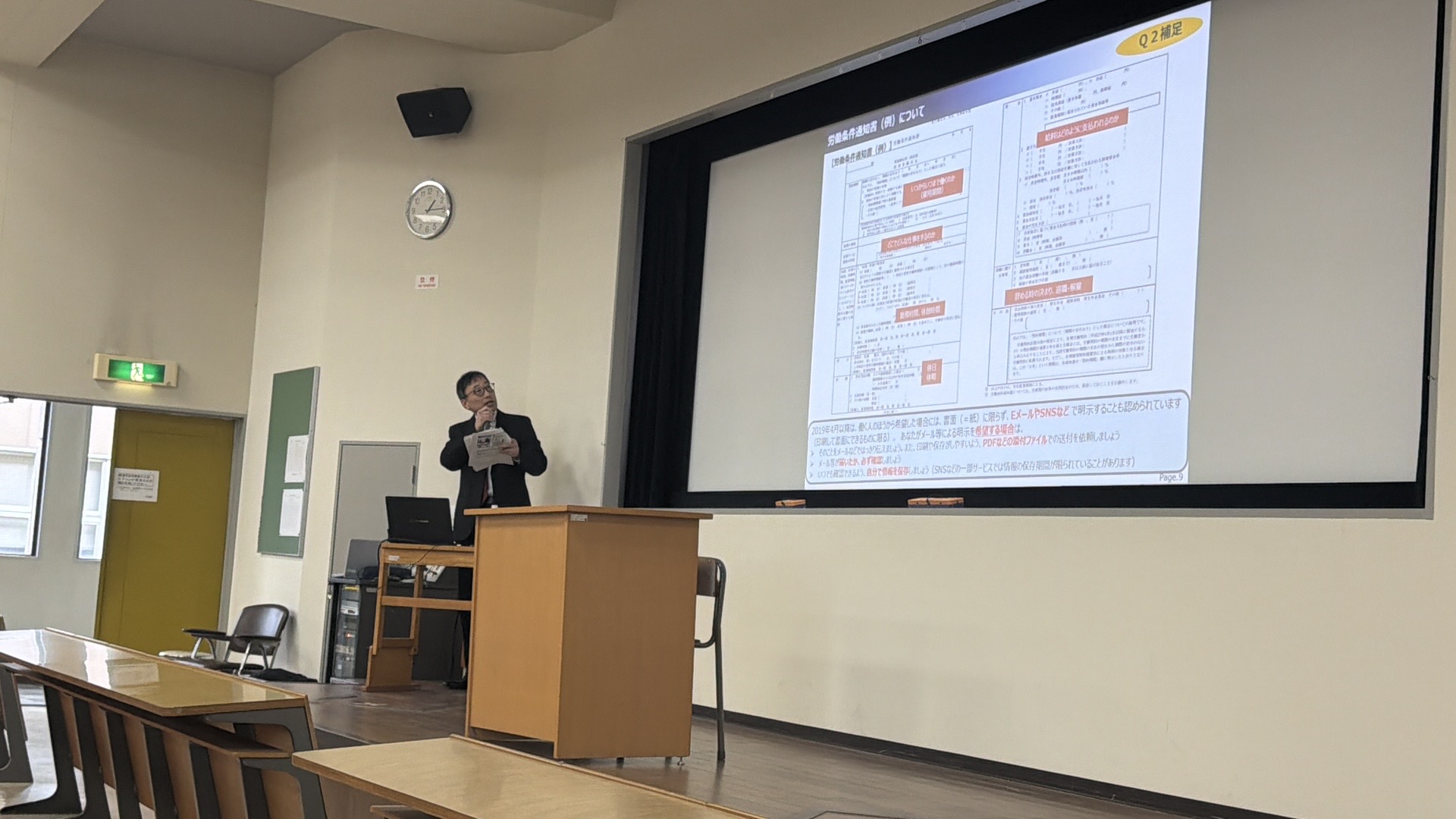 2025年12月4日(木)の総合演習IIでは、福岡労働局職業安定部職業安定課より講師をお招きし『労働法講座』が行われました。