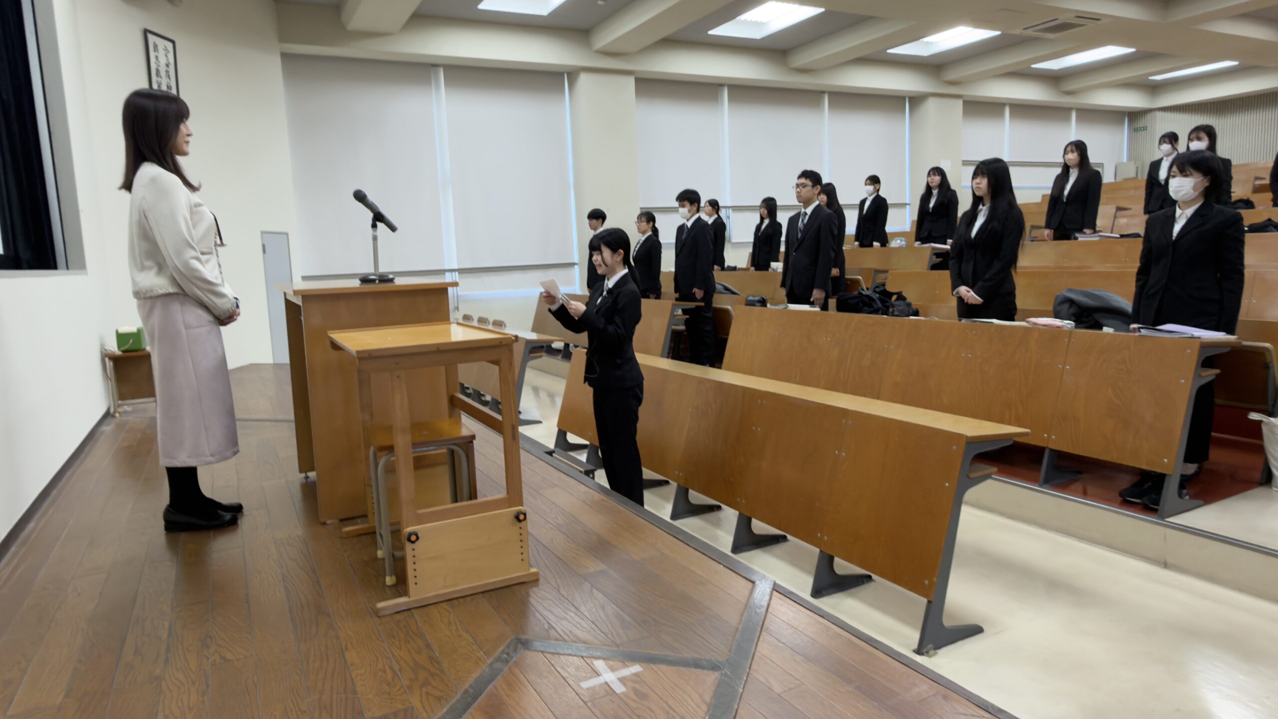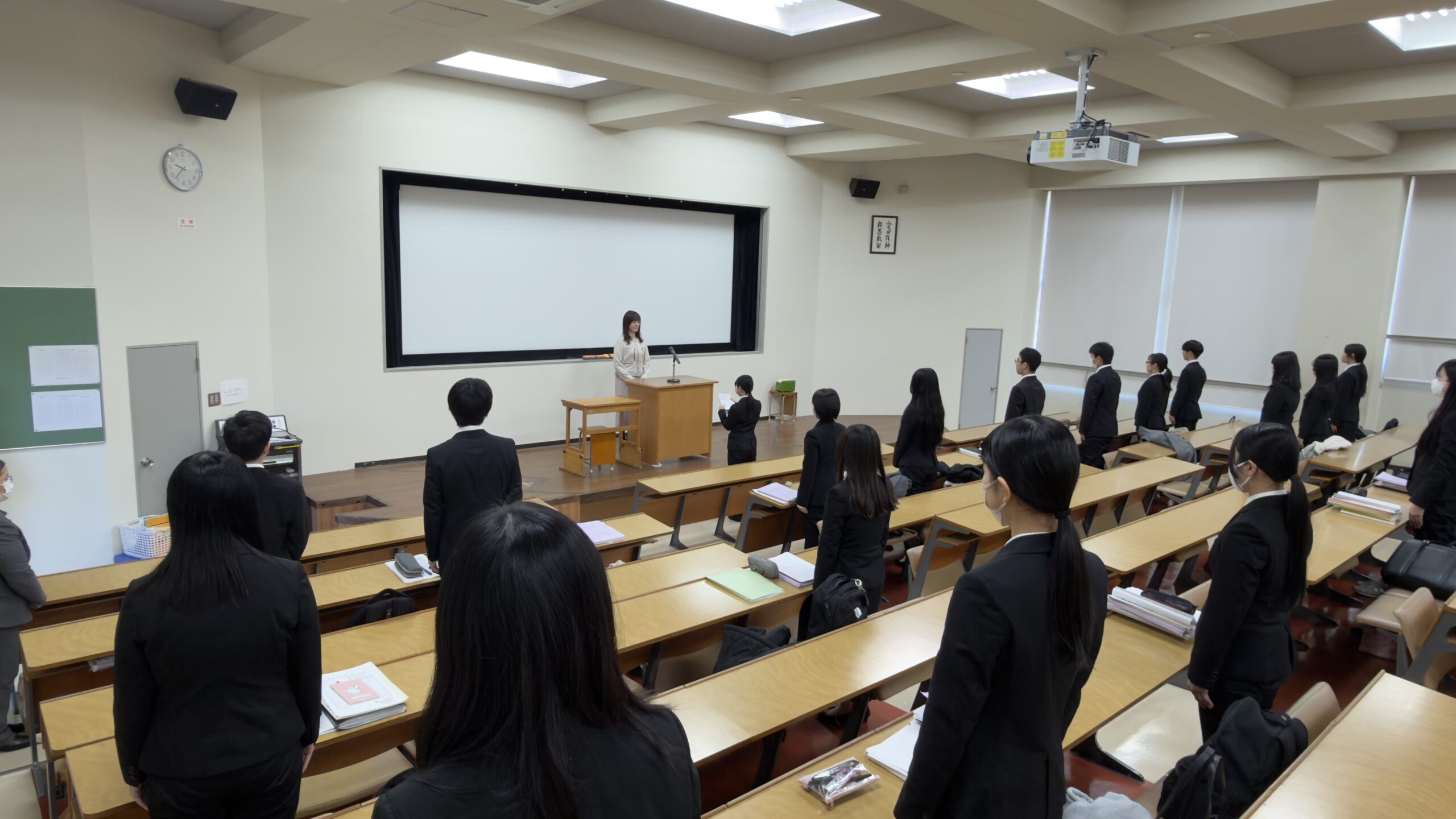 新年が明け、授業が再開されたばかりでしたが、少し着慣れたスーツに身を包み、緊張感のある表情で臨んでいる姿に保育者を目指す学生としての成長を感じることができました。昨今、インフルエンザ等が流行する中、欠席者もおらず全員元気に参加しており、実習に向けての意気込みが感じられました。