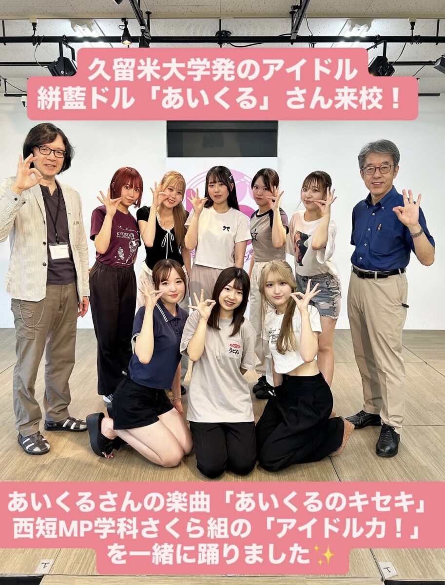 学生生活 絣藍ドルの「あいくる」さんが遊びにきてくれました Author 管理者 Date 2025年9月19日 8/21(木)西日本短期大学の福浜キャンパスに 久留米大の学生アイドルである、 絣藍ドルの「あいくる」さんが遊びにきてくれました それぞれの楽曲を一緒に踊ったり、パフォーマンスを披露したりと楽しく交流させて頂きました 9