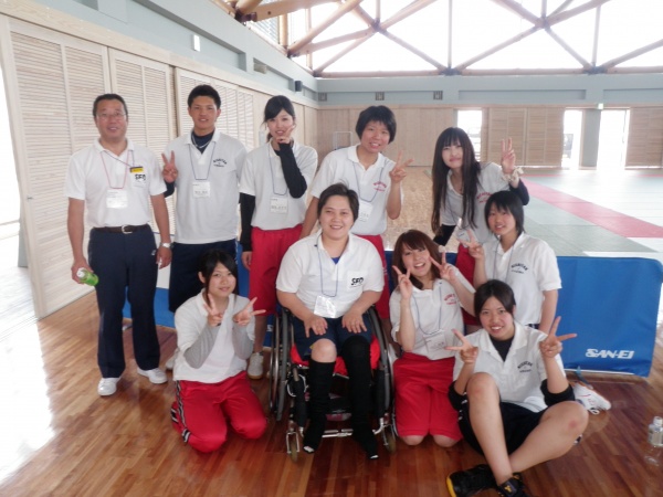 鹿島さんは、最も積極的にボランティアに参加していた学生の一人です。写真は1年生の時に水泳大会の競技役員として参加した時のものです。中心は北京パラリンピック代表選手、河村有香さんです。