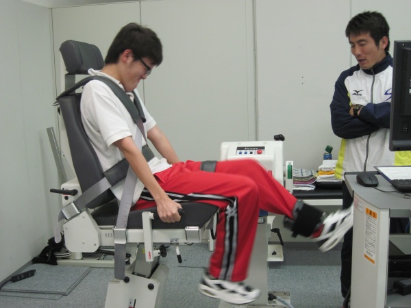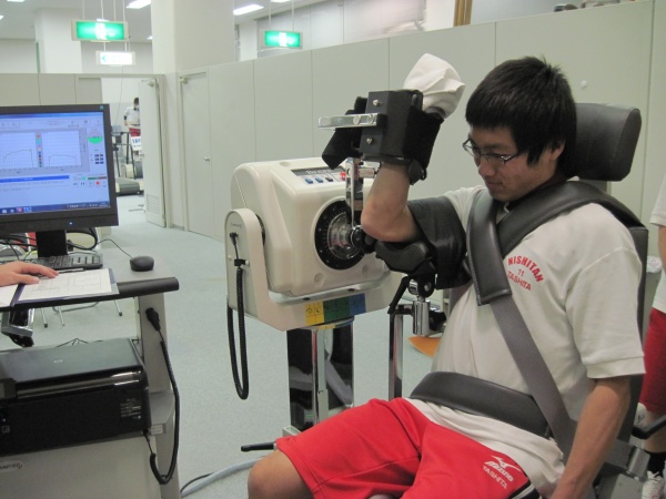 筋力の評価としては、リハビリテーションや競技スポーツで用いられる等速性筋収縮で筋出力を測定しました。