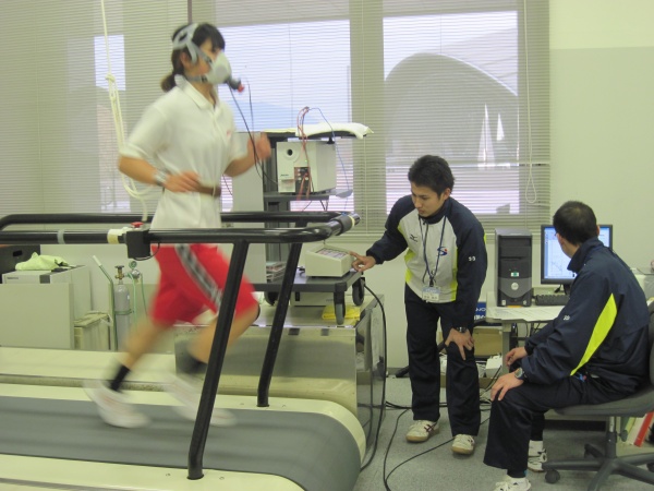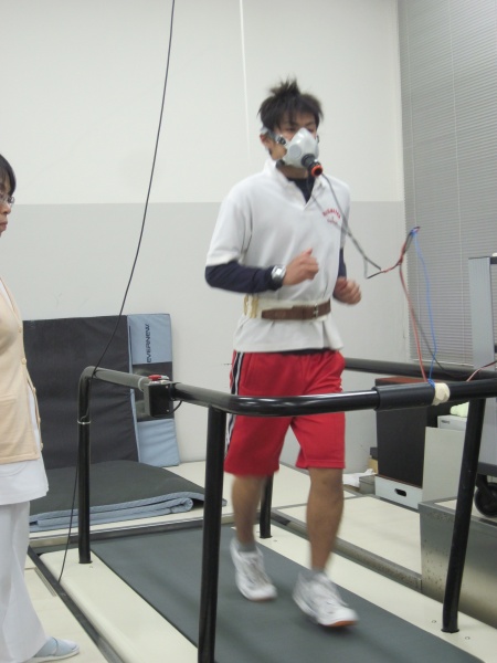 全身持久力の評価として、トレッドミル(ランニング用マシン)を用いて、ランニング中の呼気ガスを採取して最大酸素摂取量を実測しました。スポーツクラブなどに設置してあるエアロバイクや学校の授業で行う20mシャトルランでは最大酸素摂取量をあくまで”推定”しています。参加した学生も全員が初めての体験で”実測”には労力がかかることが分かったようです。