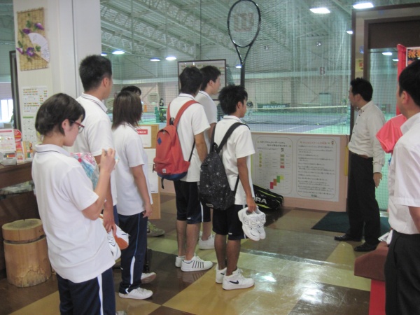 「スポーツクラブエスタ香椎」はテニス施設とフィットネス施設があり、両施設の説明をしていただきました。特に4面もあるテニスコートにテニス経験のある学生は驚いていました。