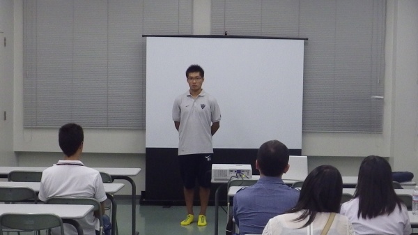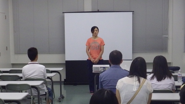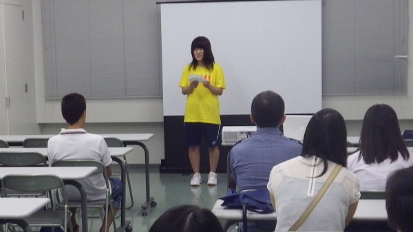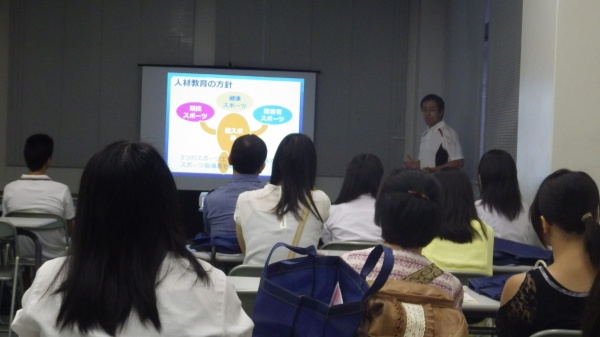 まずは学科概要説明。キャンパスライフ、入試情報、モーニング体操の紹介などの内容とさせていただきました。その後、在学生の今別府さん(1年)、卒業生の福迫さん、田下さんから高校生の皆さんへのメッセージ。今別府さんは、在学生の視点で健スポの”今”をしっかり伝えてくれました。とてもわかりやすかったですよ。福迫さんは福岡市西区にあるメディカルフィットネスセンター三幸にお勤めで、インストラクターとして活躍されています。また、田下さんは教員になるという夢を追い、本学科から初めて国立大学(鹿屋体育大学)に編入した卒業生です。お二人とも、学生時代の取り組みや学ぶことの楽しさを伝えてくださいました。本当にありがとうございました。