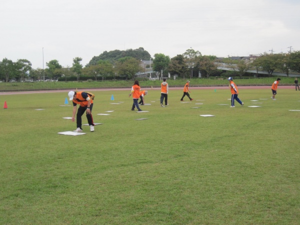 当日は時々の小雨に見舞われながら、健康スポーツコミュニケーション学科1年全員と2年の星子ゼミ2名、社会福祉学科の7名が、陸上競技、フライングディスク競技、ボール運びやカードゲーム、ボール転がしなどのレクリエーション競技をそれぞれに分かれて、準備や片付け、選手の誘導、表彰などを担当し、互いにコミュニケーションを図り予定どおり終了できました。