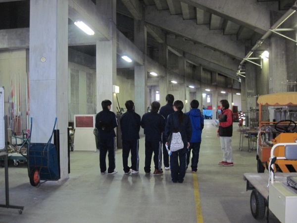 お話をいただいたのは、(公財)福岡市緑のまちづくり協会 公園管理事務所維持係の平田和子様(本学造園科卒業:現緑地環境学科)からで、博多の森で管理しているレベスタや陸上競技場、ナーセリー(圃場)の芝の管理方法から、陸上競技場の観客席の下にある倉庫で管理に欠かせない道具や機械、試合で使用する支柱やマットなどの説明を受けました。