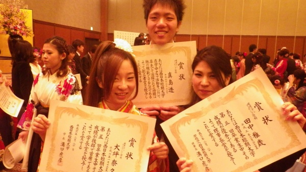 また、学長賞は大坪 奈々さん(左)、理事長賞は田中 稚歳さん(右)、創立者賞は真島 透くん(中)に授与され、在学中の功績が讃えられました。