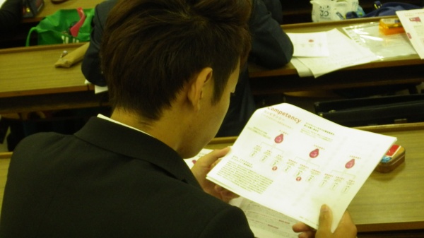 説明会では、リテラシーテストとコンピテンシーテストの結果表の見方を説明していただいたり、結果を基にパートナーとそれぞれの強みやウィークポイントをディスカッションしながら学生が主体性をもって取り組む場面も多く取り入れられました。