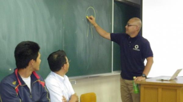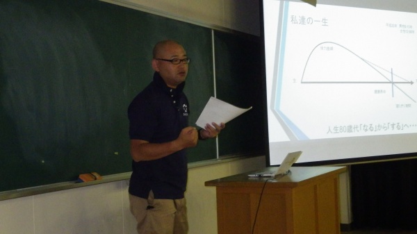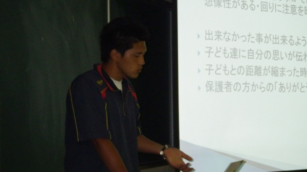 まず、日本の医療費のお話をしていただき、福岡は特に医療費が高いことを教えていただきました。その削減と、人々の幸せづくりのためにはやはり運動が欠かせないものであることも再確認できました。また、指導者の資質については、『信頼度の高いスタッフ』『コミュニケーションスキルの高いスタッフ』『お客様目線に立った支援ができるスタッフ』が大切であることも教えていただきました。現代の企業が求める人材像としては、前に踏み出す力(アクション)・考え抜く力(シンキング)・チームで働く力(チームワーク)という3つの社会人基礎力が重要視されることが分かったので、在学中に身につけられるよう取り組んでいきたいと思います。