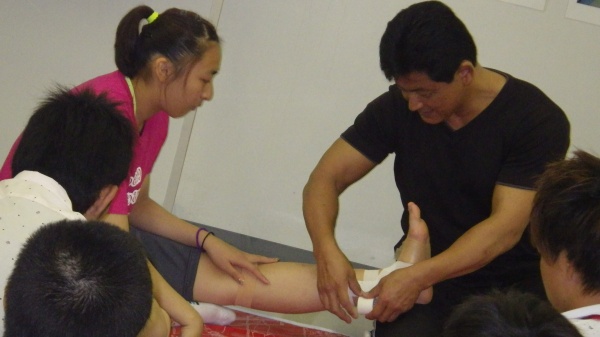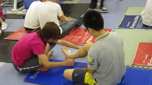 コンディショニングはトレーナーやインストラクターを目指す高校生のみなさんにとって非常に人気のあるプログラムです。テーピング処置の基本を学んだ後に、足関節のテーピングについて実践しました。次回のオープンキャンパス(8月24日)でも実施します。