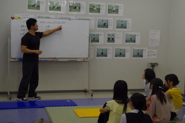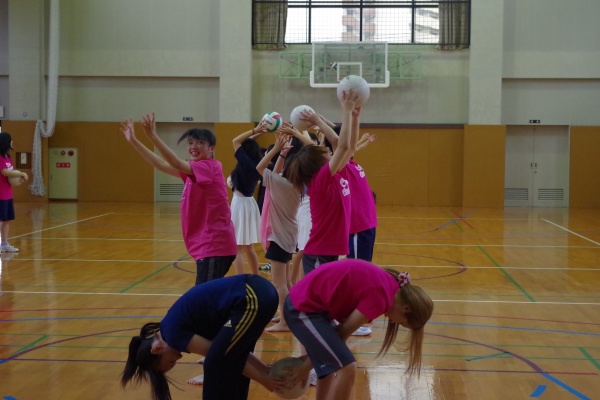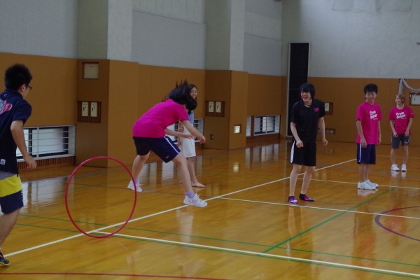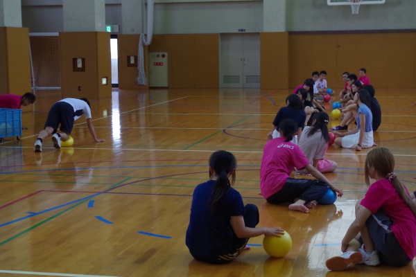 子どもの運動神経を高めるためのトレーニングを、ボールやフラフープを用いて行いました。高校生のみなさんにも楽しんでいただけたのではないでしょうか。