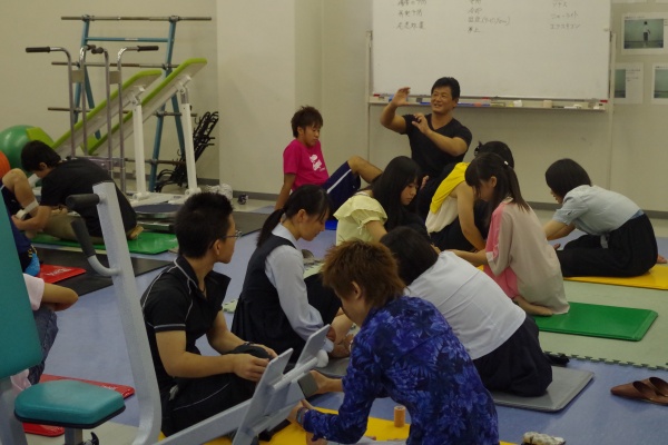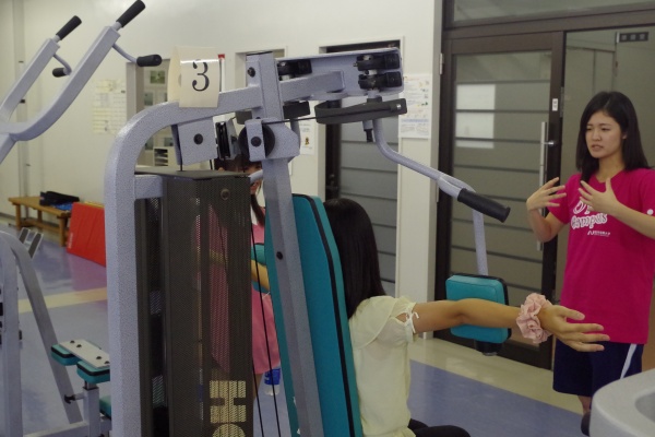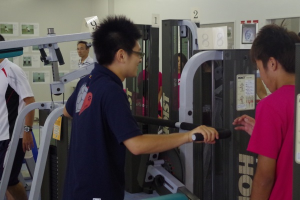 トレーニングルームにおいて、サポートしてくれた学生と共にレジスタンス(ウェイト)トレーニング体験を行いました。
