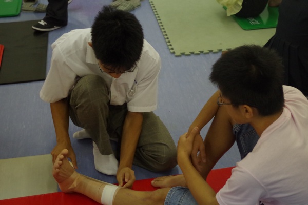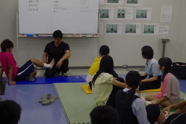 トレーナーやインストラクターを目指す高校生のみなさんにとって非常に人気のあるプログラムです。テーピング処置の基本を学んだ後に、足関節のテーピングについて実践しました。