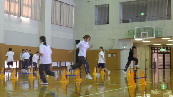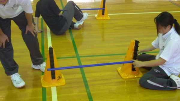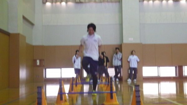 実技講習では、まずマルチハードルを用いて「走る」「跳ぶ」の機能に着目したプログラムに取り組みました。