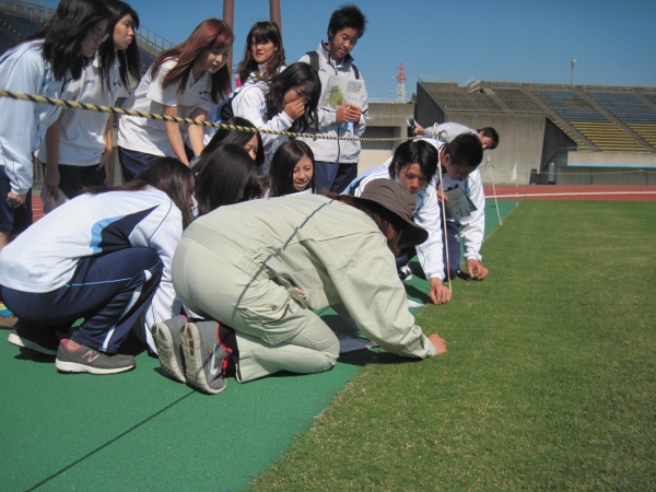 先ずは、博多の森陸上競技場の芝で、縦に伸びる冬芝でオーバーシートをして横に伸びる夏芝を守ることなどを学習しました。