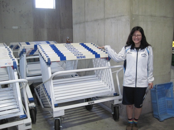 他の競技場にもある観客席下の倉庫を見学させていただき、大会で使用するハードルや投擲競技のハンマー、円盤、その他スターティングブロックなど所狭しと片付けてありました。