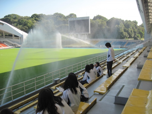スタジアムで使用されるラインは植物にやさしいペンキを使用し、このスタジアムを他の競技で使用する場合は、芝と同色のペンキで上塗りをして消し、新たに白色で塗るとのことでした。選手の安全だけでなく、環境のことも考えて施設管理だと実感しました。