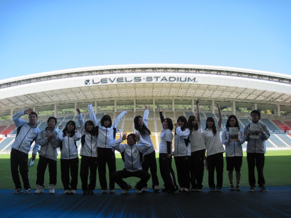 平成26年10月15日(水)、2年生後期選択科目「スポーツ施設管理論」でレベルファイブスタジアムに行って、芝の管理研修を受けてきました。台風19号が過ぎ去り、まさに台風一過の青空の中、福岡市緑のまちづくり協会、九州グラウンド株式会社様のご協力を得て、はじめて聞く話や普段立ち入ることのできない場所の見学研修に充実した時間を過ごしました。