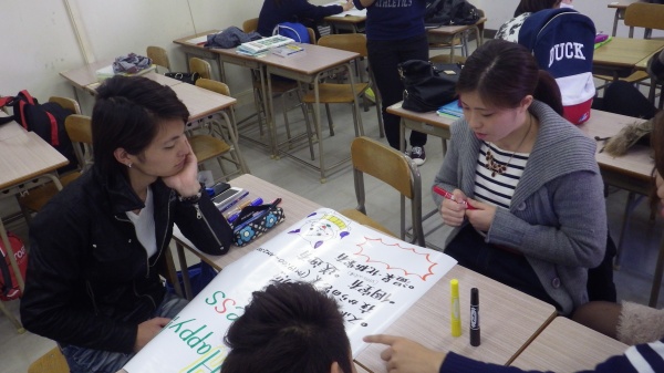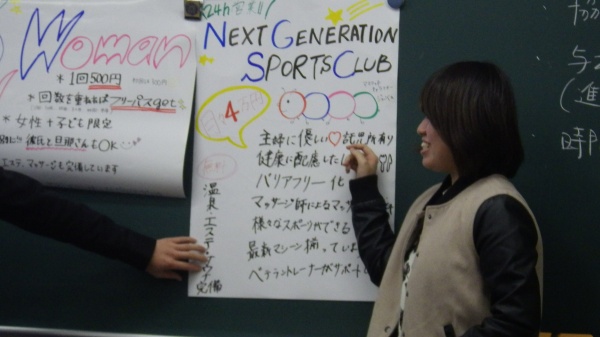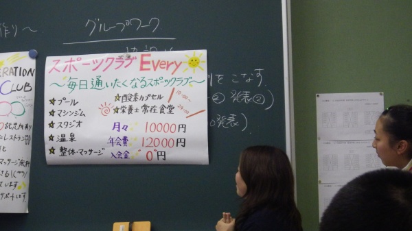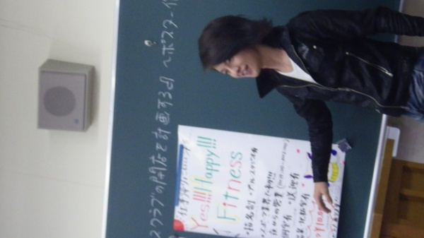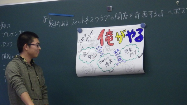 テーマは『魅力あるフィットネスクラブの開店を計画する~ポスター作り~』とし、5つのグループに分かれてディスカッションと作業を進めました。その後、各グループの発表を行い投票によって最も魅力ある店舗を決定しました。