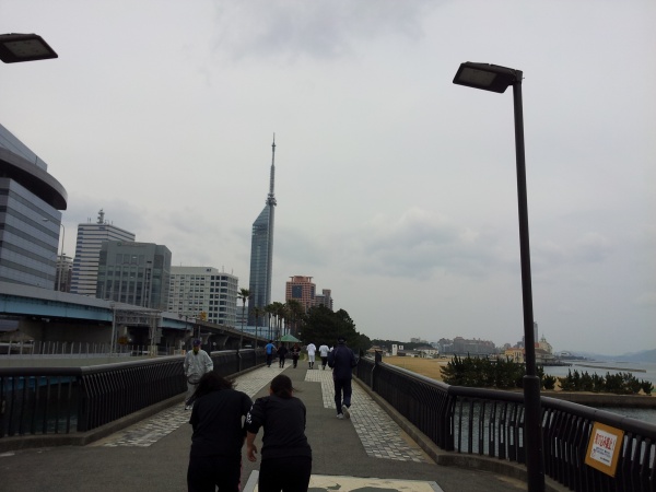 また、昨日は総合演習の時間を活用して会場のシーサイドももち海浜公園に行き試走を行いました。参加する学生たちは、解放感抜群のコースで汗を流しました。