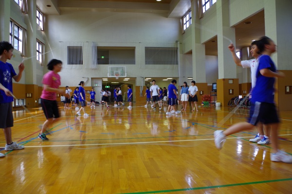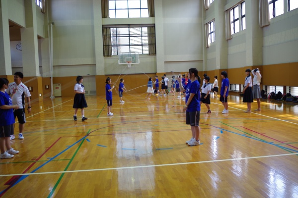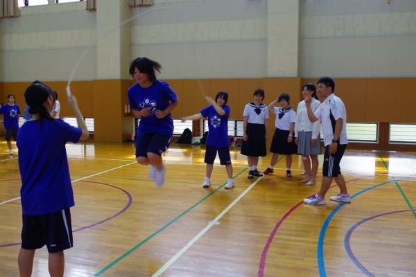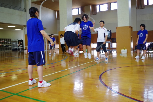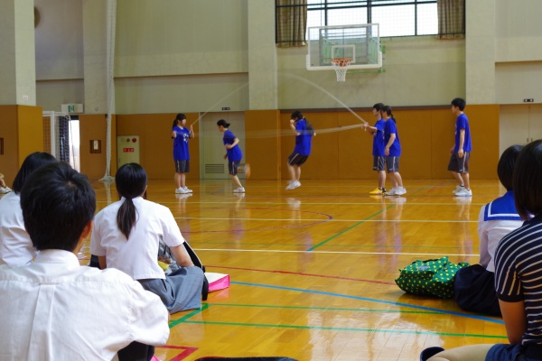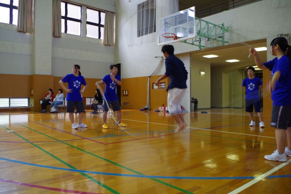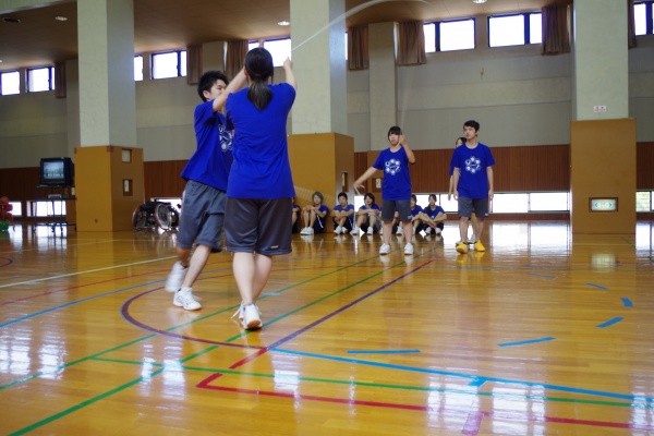 体験の一つ目として、在学生がダブルダッチを披露しお越しいただいたみなさんにも体験していただきました。みなさんとても上手で在学生もびっくりでした。