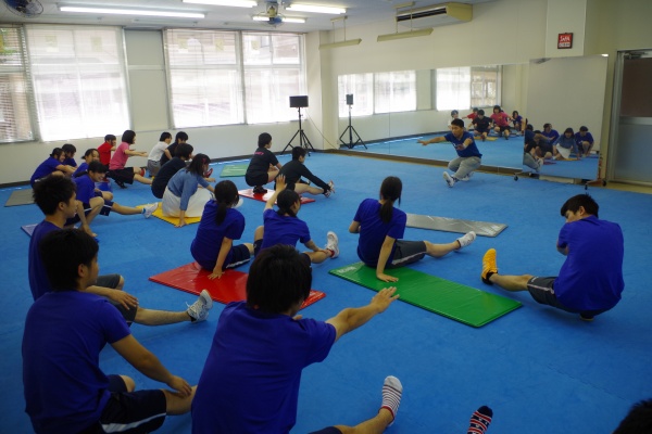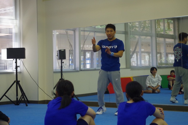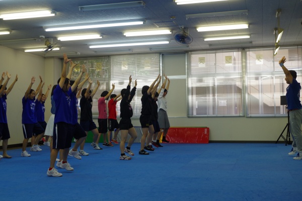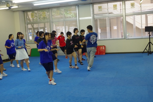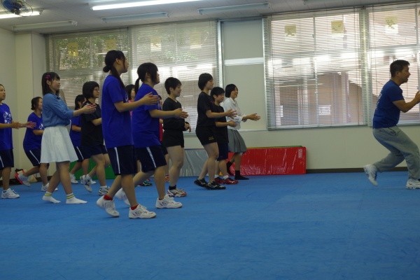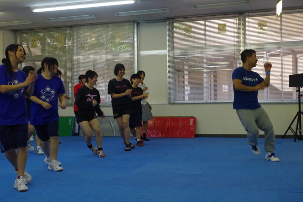 学食で昼食をとっていただいた後は、平塚先生によるエアロビックダンスエクササイズを体験していただきました。先生のおもしろいトークと楽しいエクササイズで大盛況でした。