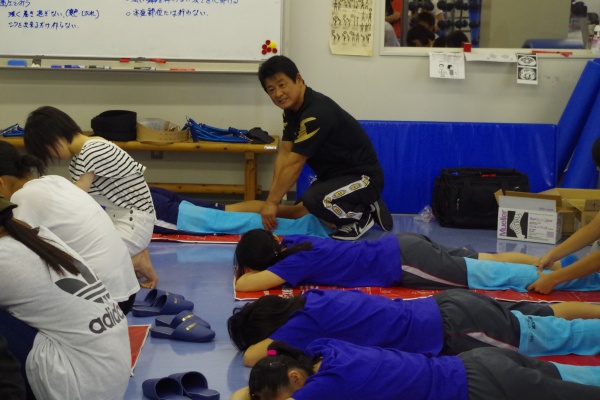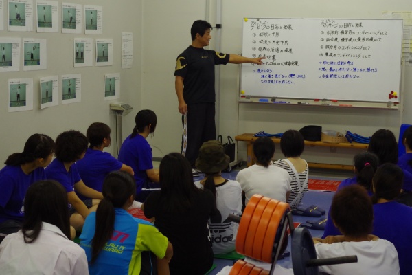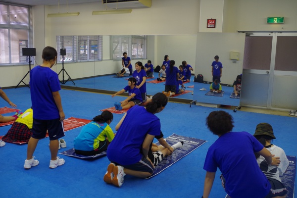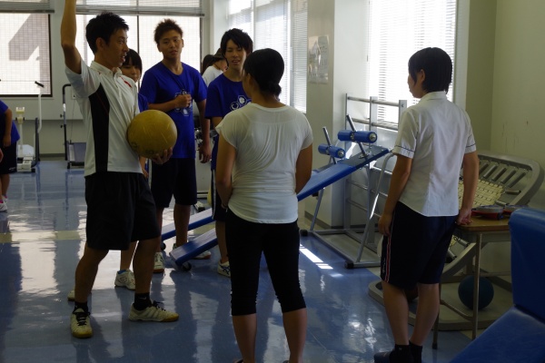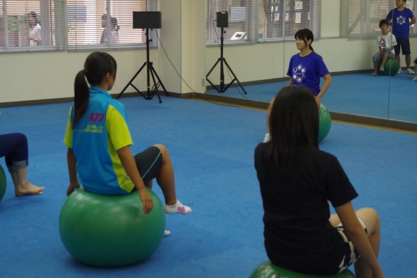その後、星子ゼミの学生によるバランスボールを用いた『ボールエクササイズ』を体験していただきました。フィットネスクラブではよく行われているエクササイズです。来場してくださったみなさまと学生とのペアで、主に体幹を鍛えるエクササイズで汗を流しました。