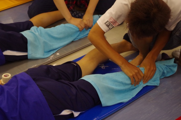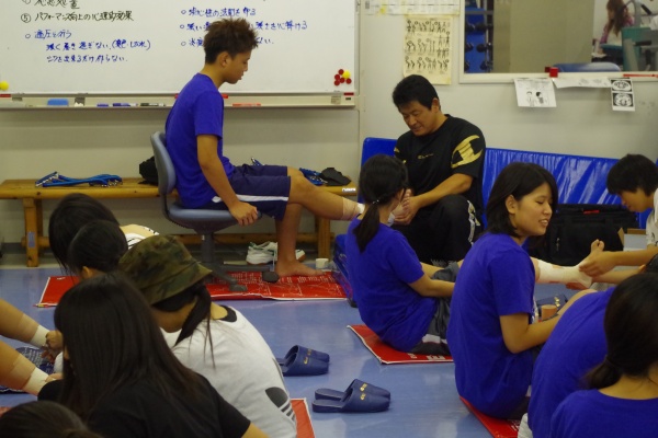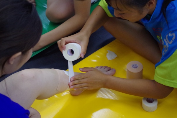 そして、午前中の2つ目のプログラムは『テーピング&マッサージ』。授業でもお世話になっている片井先生に担当していただきました。参加してくださったみなさまには、捻挫をしたと仮定して3種類のテーピングを用いて足関節の固定法を体験していただきました。その後は、マッサージの基本的な知識と共に、ふくらはぎのマッサージ法を体験していただきました。