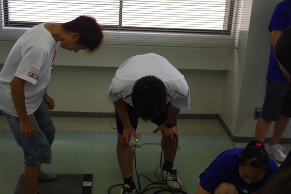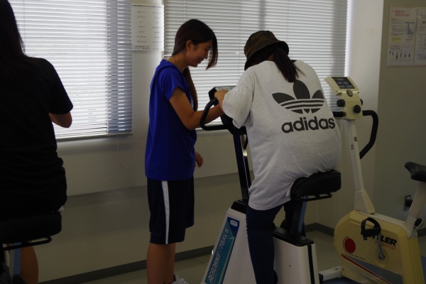 そして、最後は本学のトレーニングジムでマシーントレーニング体験と運動能力測定を行いました。マシーントレーニング体験では、学生が日々学んでいることを伝えながらトレーニングを行いました。また、運動能力測定では、ステップカウンターを用いた俊敏性の測定と、転倒に関わると考えられている足指筋力(足指の牽引力)を測定しました。