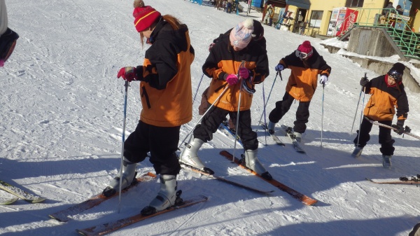 スキー場に到着すると、早速ウェアをレンタルして初日の実習がスタート。1時間半ほどでしたが、止まり方や転び方などの基本を学び、2日目からの実習の準備を行いました。