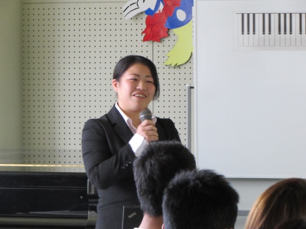 さて、西日本短期大学では平成27年度春のオープンキャンパスが、3月12日(土)に開催されました。全体会では6学科の卒業生の挨拶にはじまり、健康スポーツコミュニケーション学科では学長賞(首席卒業)を授与されました内田朱音さんに、入学を決めたポイントや学生生活、資格取得、卒業後の進路などをお話しいただきました。