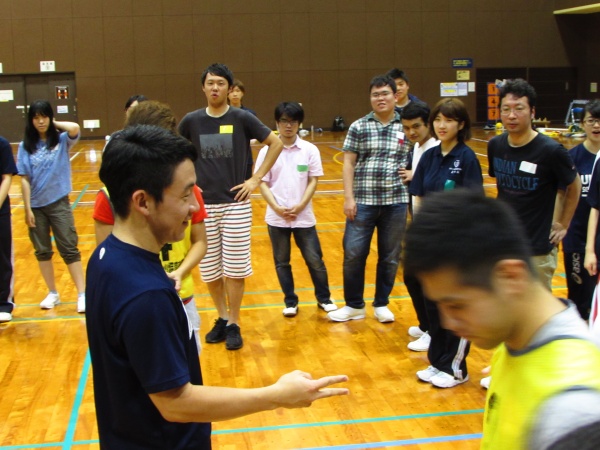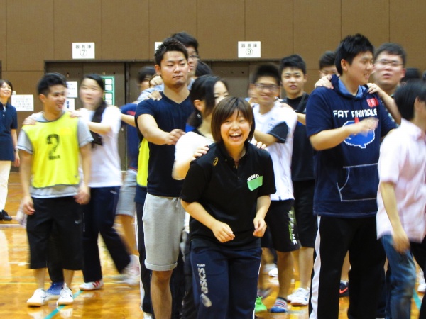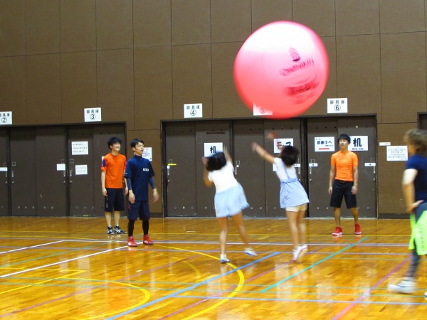 午前中は、学生同士でレクリエーションの指導をする全体会が行われました。しっぽ取りゲームやボール渡しゲーム、ジャンケン列車、レクダンスなど学校の壁を越え、交流ができました。