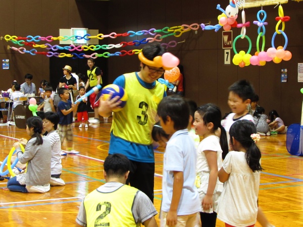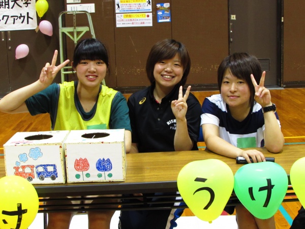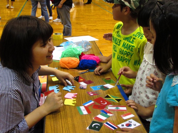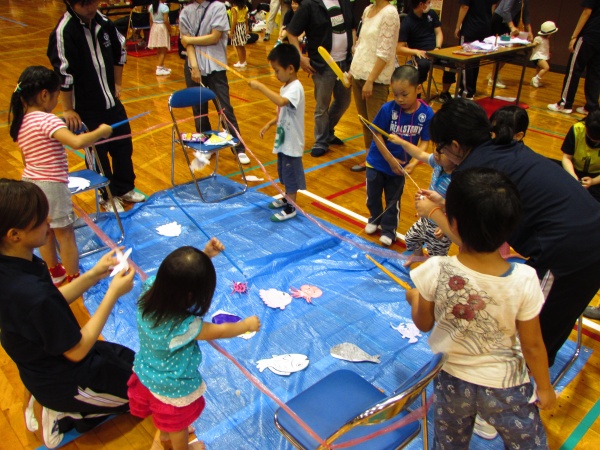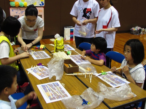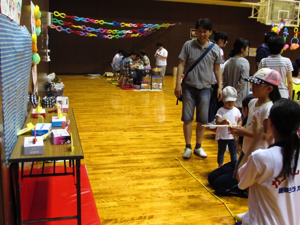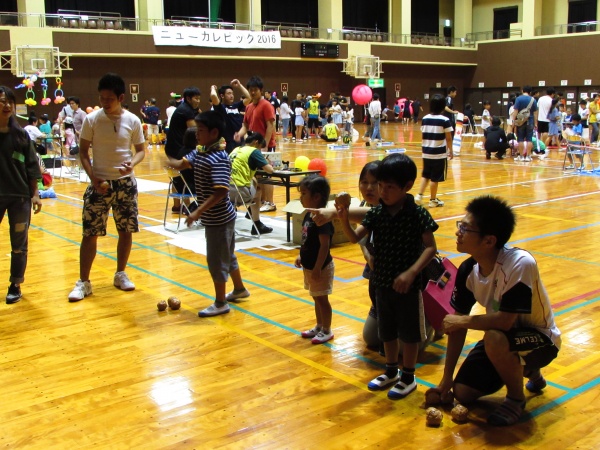 午後からは近隣の小学生や家族を対象に、学校ごとのゲームブースでレクリエーションの指導を行いました。ジャンボジェンガをはじめ、割り箸鉄砲、バンブーダンス、ボウリング、国旗かるた、キンボール、アートバルーン、魚つりなどのブースが用意され、星子ゼミでは手作りストラックアウトを指導しました。学生はもちろんのこと、幼児からお母さんまで真剣に的をめがけて投げていました。