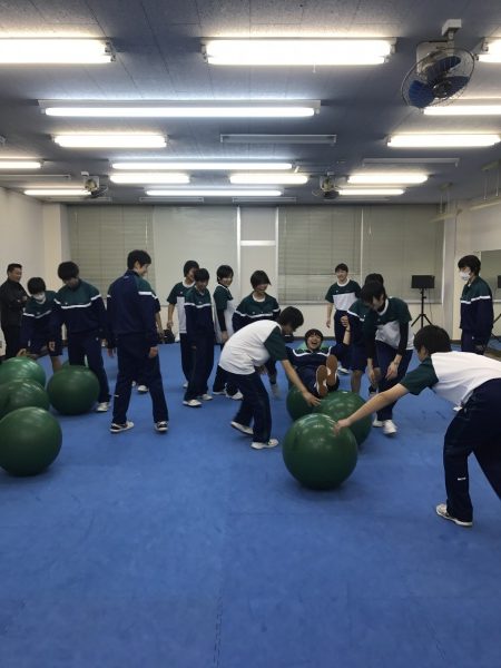 さて今週月曜日には、西短付属高校の2年生が福浜キャンパスを訪れ、各学科の模擬授業を体験しました。健スポでは授業テーマを「コーディネーショントレーニング」として、ダンススタジオでバランスボールを使ってのトレーニングやグループアクティビティ(写真)を体験してもらいました。修学旅行帰りとのことで疲れが心配でしたが、みんな積極的に取り組んでくれて笑顔あふれる時間となりました。