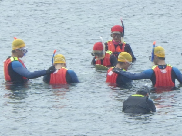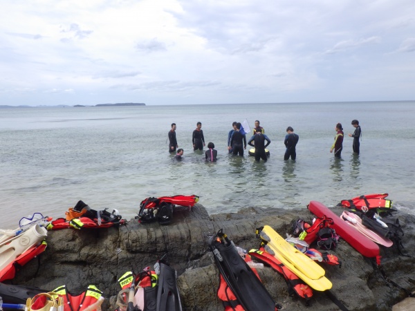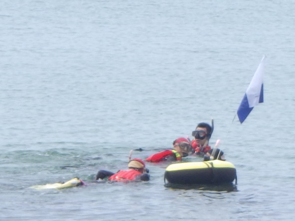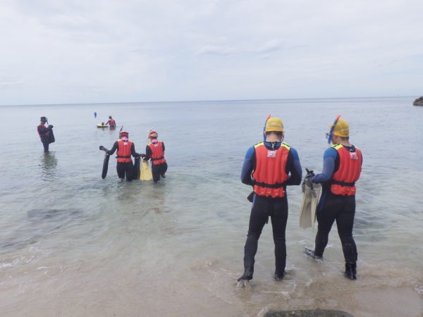 始めに、各器材の使い方を教えて頂き、その後はウェットスーツやフィン、スノーケルを着用してスノーケリングを体験しました。初めての本格的なスノーケリングで、魚もたくさん見れたようです。