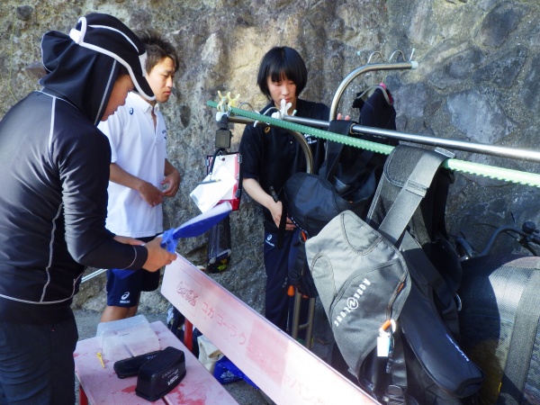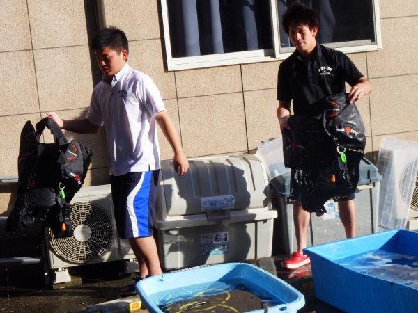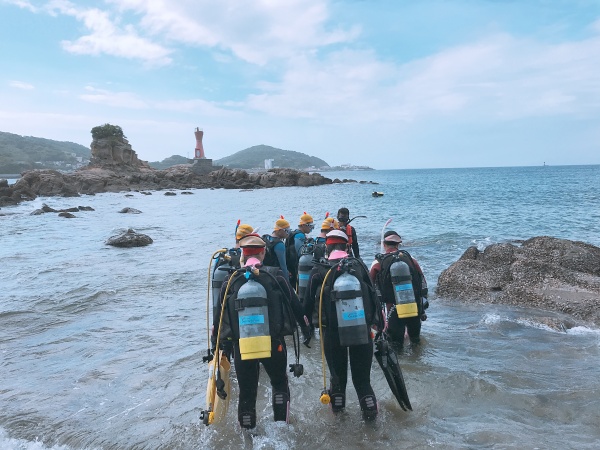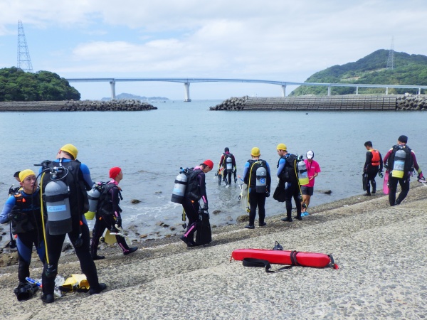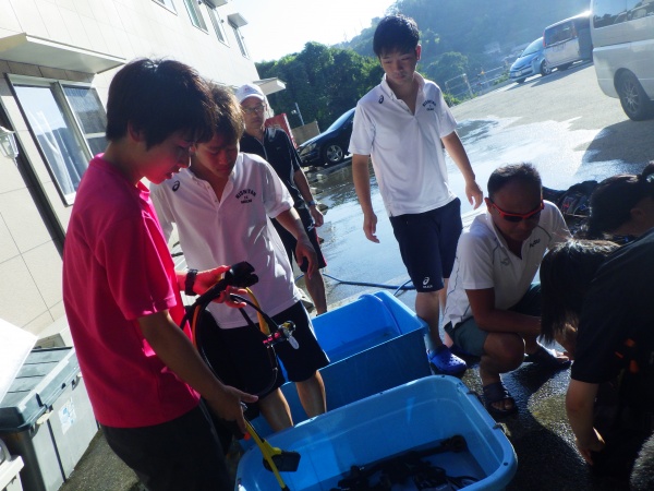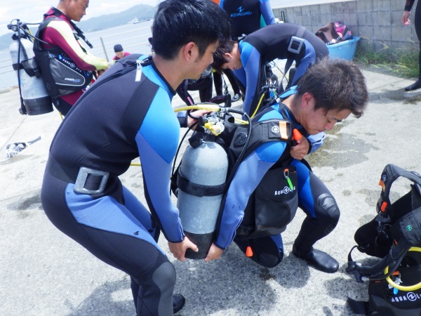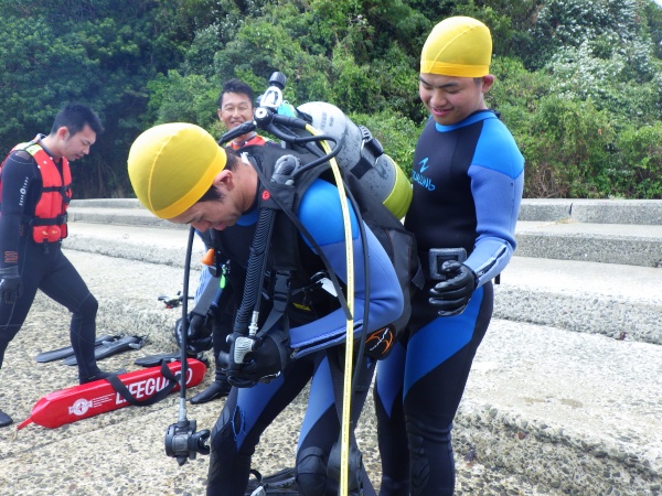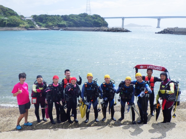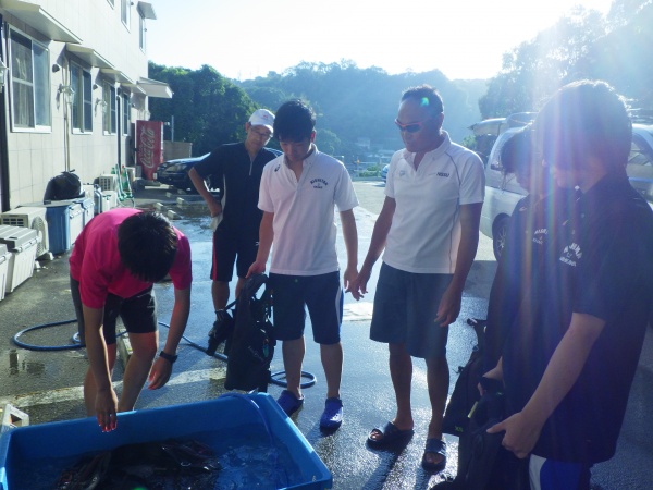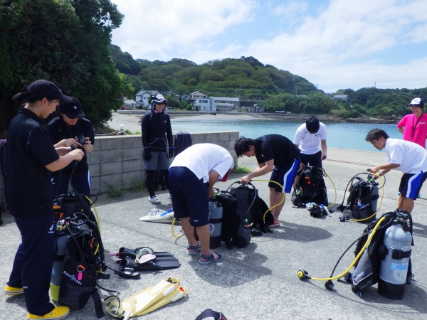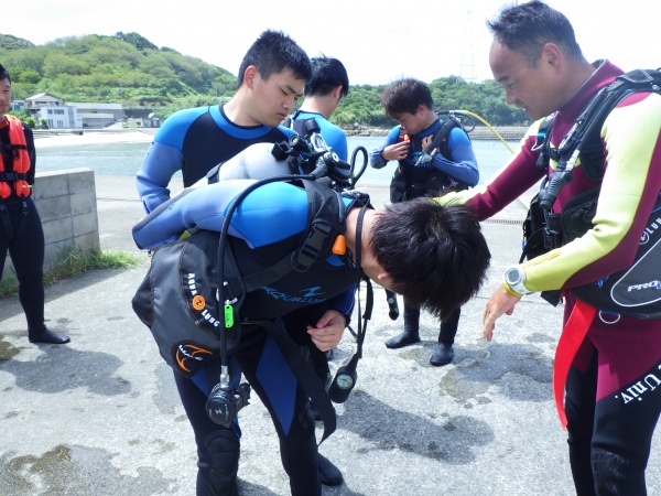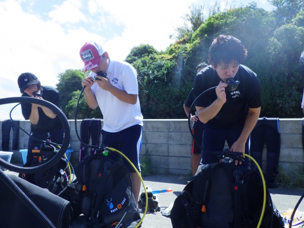 この日は、長崎県辰の口海岸で実習を行いました。最初に器材の使い方を陸上で教えて頂き、バディ同士で協力しながらセッティング方法を覚えました。その後海に潜り、初めてのスクーバダイビングを行いました。夜の講習会では、初日の筆記試験が返却され、無事全員が合格しました。残すは実技試験です。