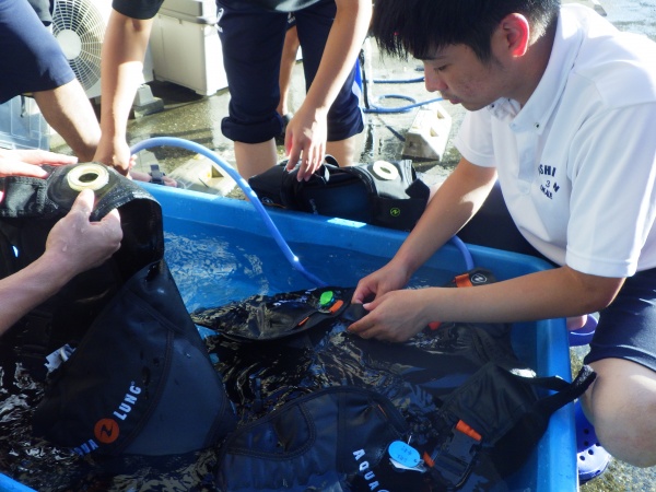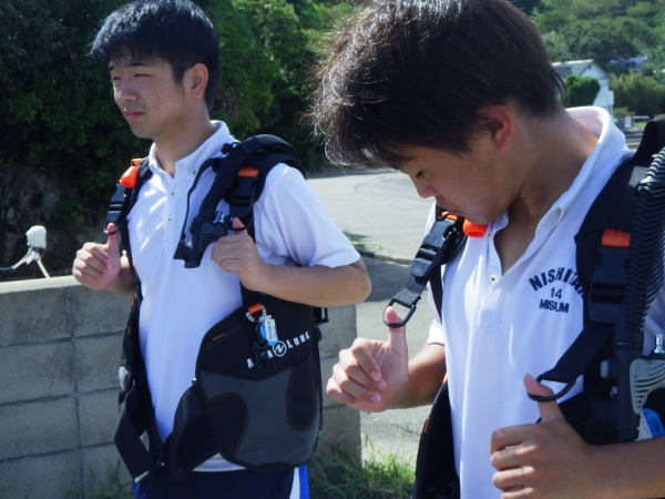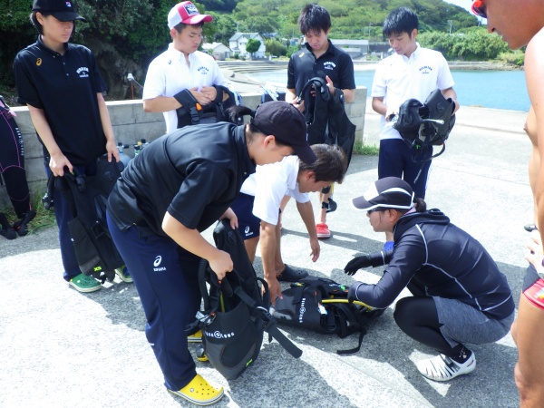 今回も、8月末から行われた1年生のマリンスポーツ実習の様子を報告します。マリンスポーツ実習は例年、座学1日、海洋実習3日の日程の中で、(株)マリン・フェローズのインストラクターの方々にご指導いただきNAUIパスポートダイバーという資格取得を目指します。