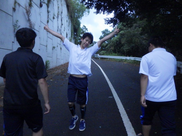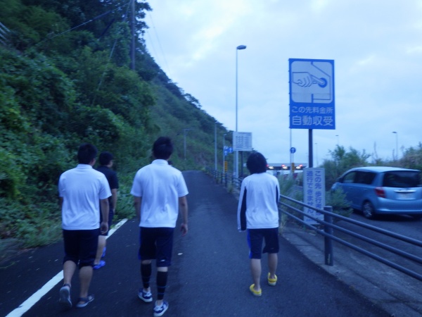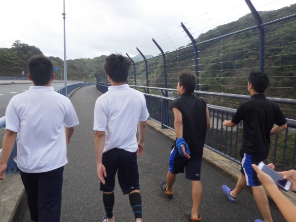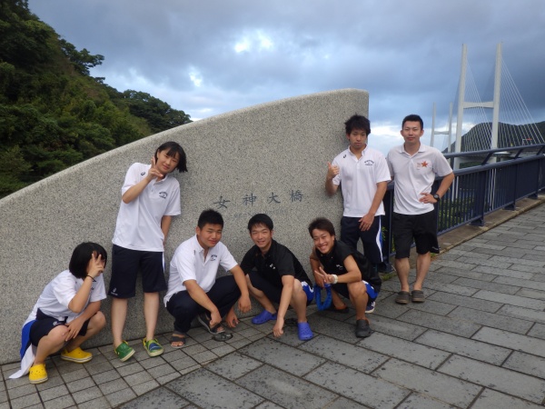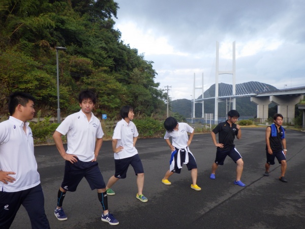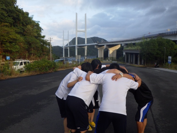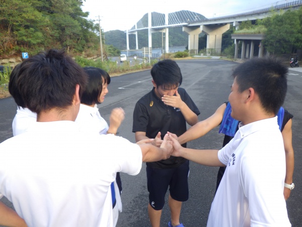 この日は午前6時の散歩から始まりました。女神大橋をみんなで渡り、体操、チームで円陣を組んで、最後の実習に向けて士気を高めました。