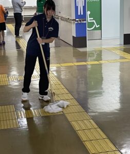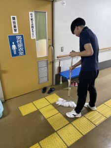 障がいのある方が安心して水泳記録会に参加できるよう、館内清掃や会場内の誘導などの業務を担当しました。